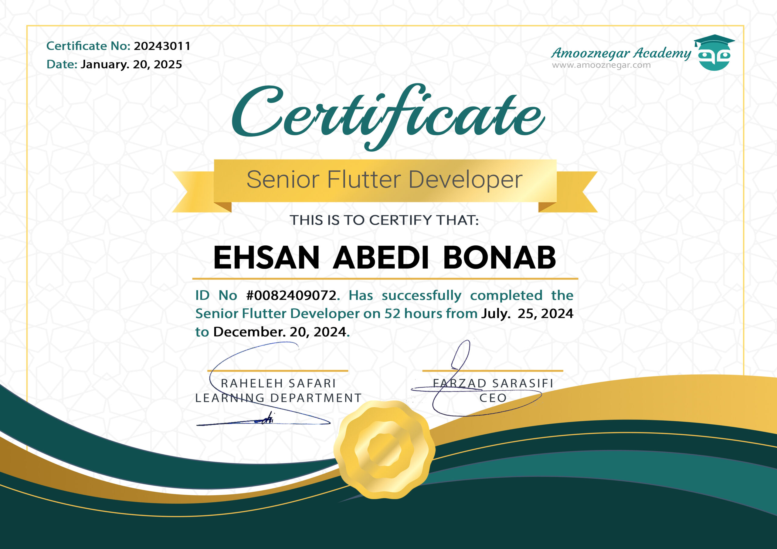 من احسان عابدی ، یک برنامهنویس و توسعه دهنده فلاتر هستم که علاقهمند به توسعه اپلیکیشنهای موبایل با استفاده از تکنولوژیهای مدرن و هوشمند هستم.